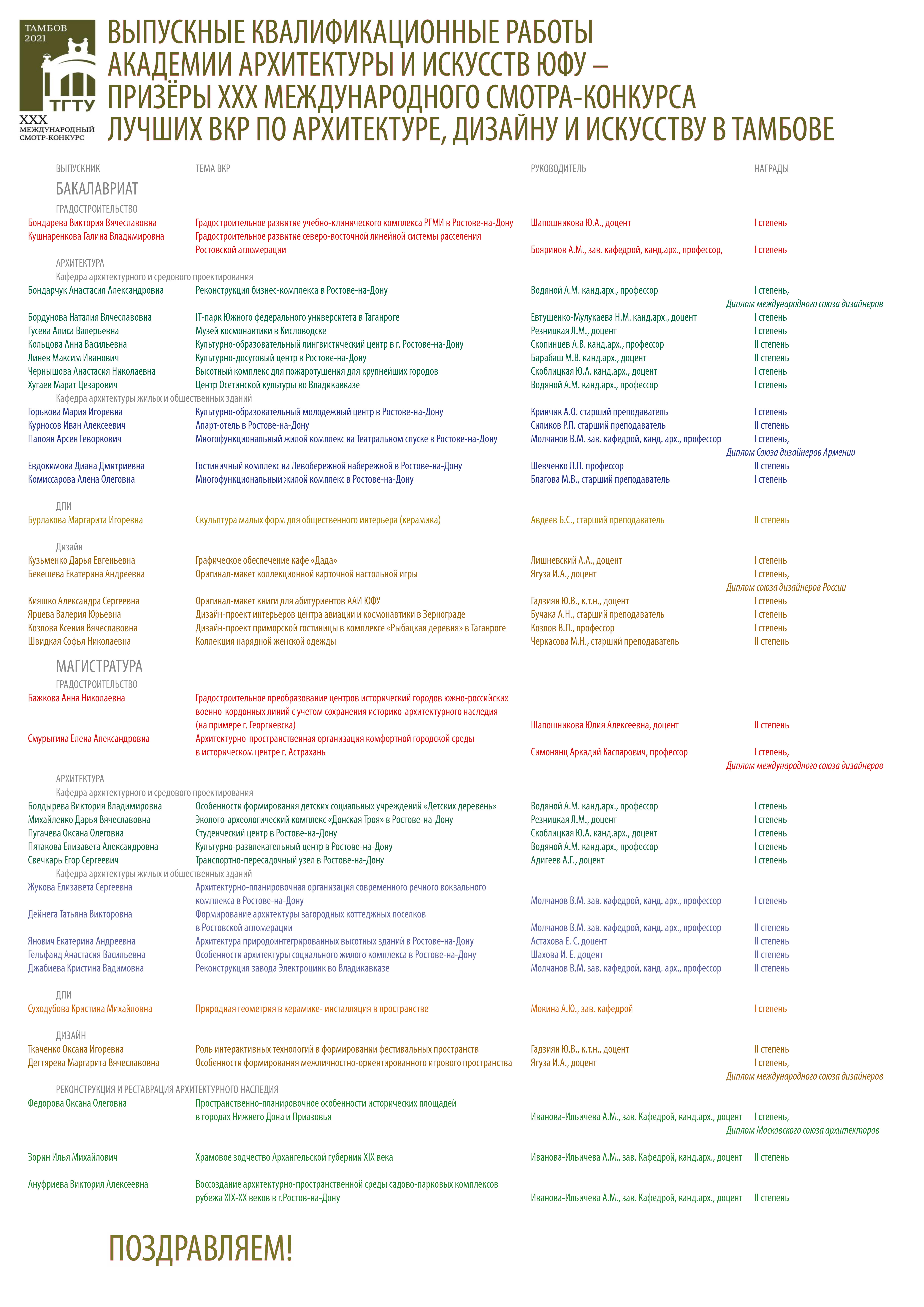 2 ноября завершился XXXIII МЕЖДУНАРОДНЫЙ СМОТР-КОНКУРС лучших выпускных квалификационных работ по архитектуре, дизайну и искусству, проходивший в этом году в Екатеринбурге. Работы Академии архитектуры и искусств получили престижные награды - 15 дипломов 1-й степени, 4 диплома 2-й степени и 1 диплом 3-й степени. Три работы получили дополнительные награды конкурса. Поздравляем победителей и призёров конкурса!