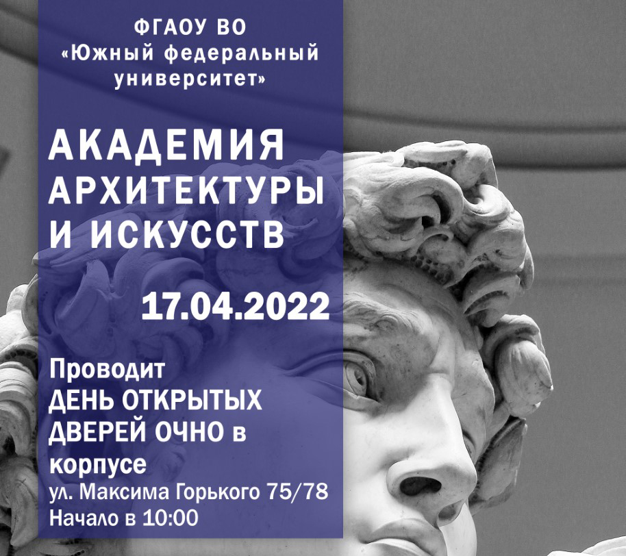АКАДЕМИЯ АРХИТЕКТУРЫ И ИСКУССТВ ЮФУ ПРОВОДИТ СЕРИЮ ДНЕЙ ОТКРЫТЫХ ДВЕРЕЙ В ОЧНОМ ФОРМАТЕ СОГЛАСНО РАСПИСАНИЯ: