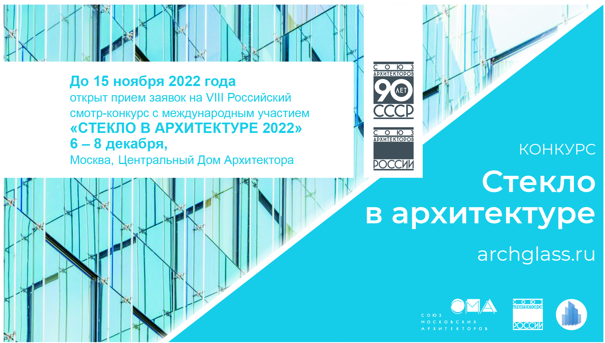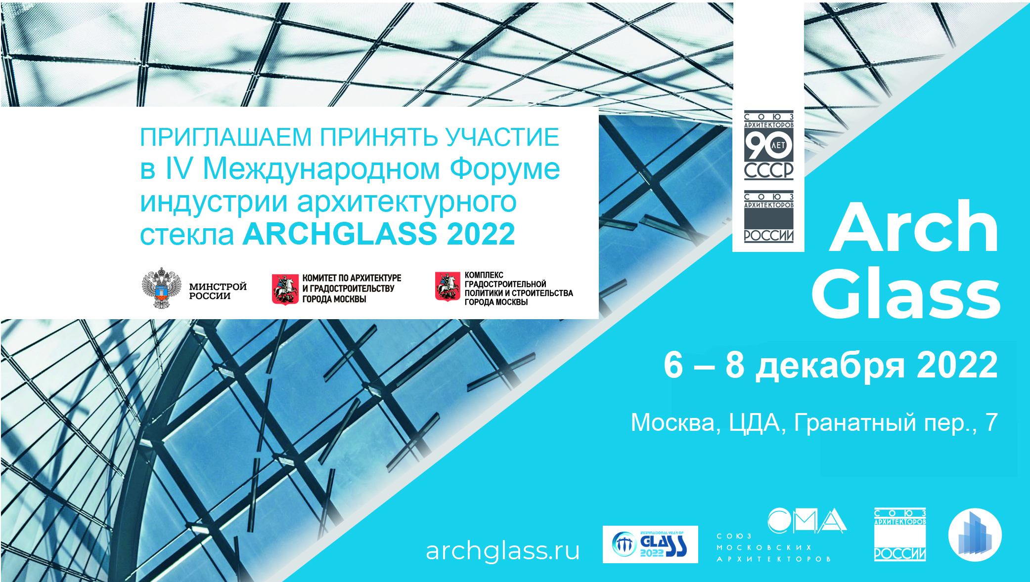 Союз архитекторов России приглашает Вас принять участие в IV Международном форуме индустрии архитектурного стекла ARCHGLASS 2022, который состоится в Центральном доме архитектора в Москве с 6 по 8 декабря 2022 года. Форум ARCHGLASS 2022 включён в программу «Международный год стекла 2022 (под эгидой ООН)», одной из главных тем которой стала тема «Стекло в архитектуре».
