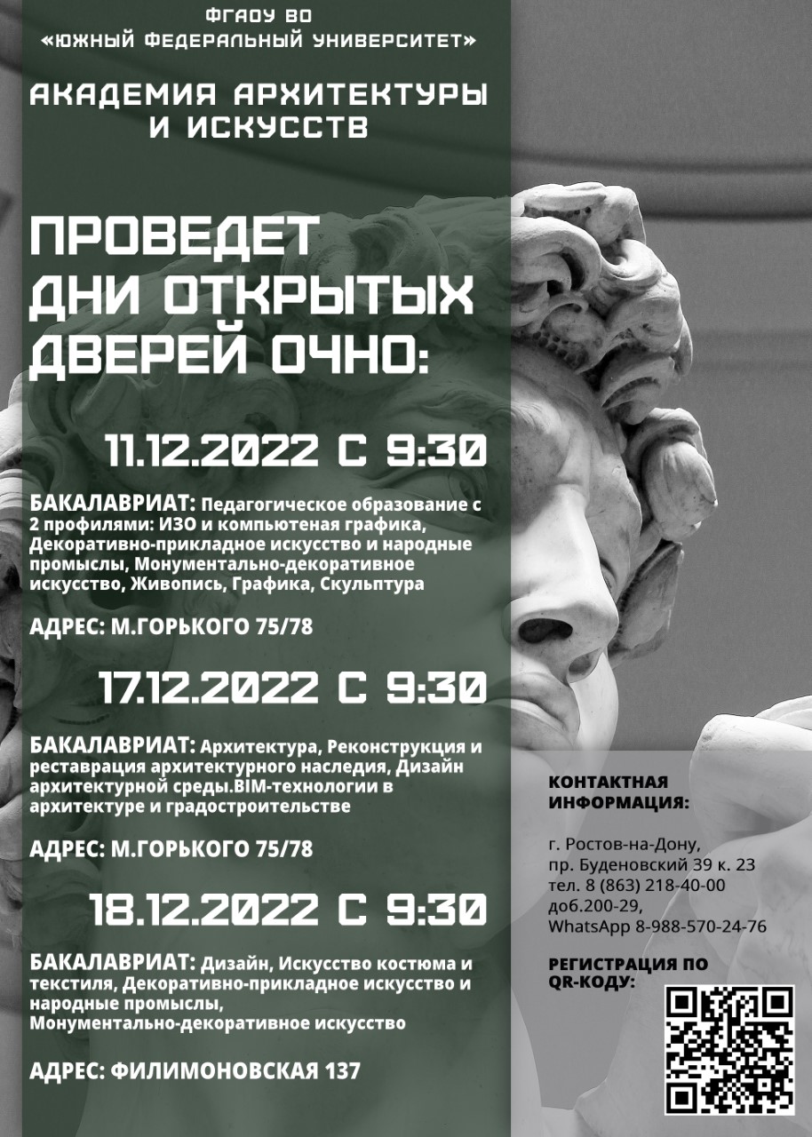 АКАДЕМИЯ АРХИТЕКТУРЫ И ИСКУССТВ ЮФУ ПРОВОДИТ СЕРИЮ ДНЕЙ ОТКРЫТЫХ ДВЕРЕЙ В ОЧНОМ ФОРМАТЕ 16 И 17 ДЕКАБРЯ 2023 ГОДА