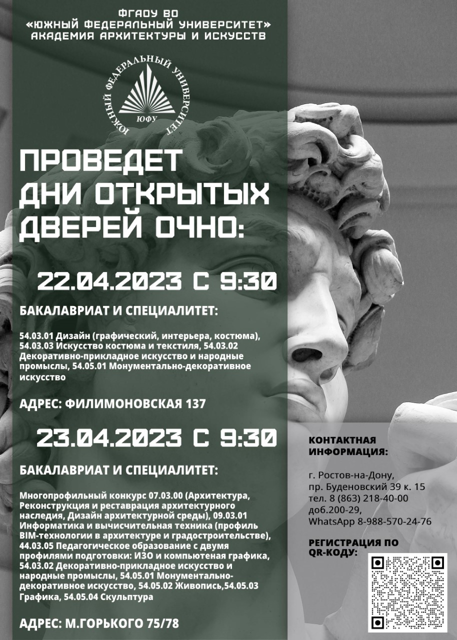 АКАДЕМИЯ АРХИТЕКТУРЫ И ИСКУССТВ ЮФУ ПРОВОДИТ СЕРИЮ ДНЕЙ ОТКРЫТЫХ ДВЕРЕЙ В ОЧНОМ ФОРМАТЕ 20 И 21 АПРЕЛЯ 2024 ГОДА