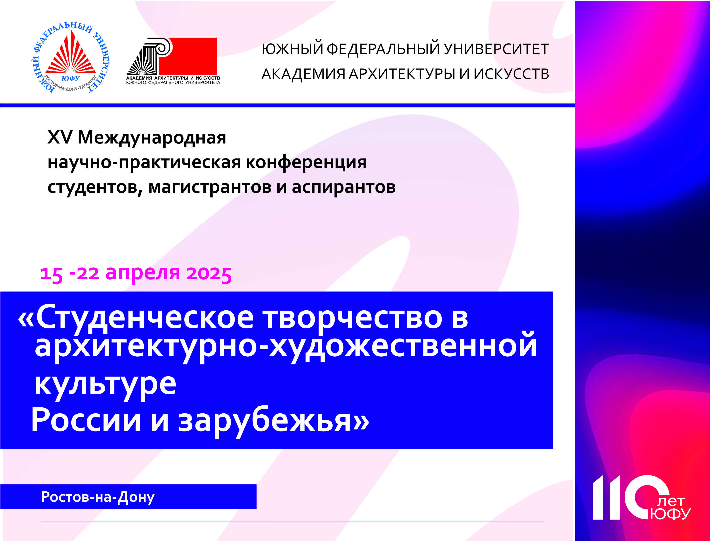 В целях развития межуниверситетских отношений и академических связей, празднования 110-летия Южного федерального университета и активизации научно-исследовательской деятельности студентов, магистрантов и аспирантов на базе Академии архитектуры и искусств с 15 апреля по 22 апреля пройдет XV Международная научно-практическая конференция студентов, магистрантов и аспирантов «Студенческое творчество в архитектурно-художественной культуре России и зарубежья»